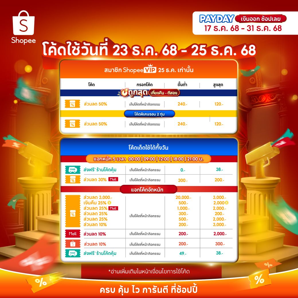 โปรโมชัน Shopee 12.25 Pay Day Sale มหกรรมลดราคาครั้งใหญ่ครั้งสุดท้ายของปี 2568 ใครที่กำลังมองหาของขวัญจับฉลาก ของขวัญปีใหม่ บอกเลยว่านี่คือโอกาสที่จะได้ช็อปสินค้าในราคาสุดคุ้ม เพราะ Shopee มีสินค้ามาให้เลือกช้อปแบบจุใจ แบรนด์แท้ลดสูงสุด 70% และโค้ดส่งฟรี* ขั้นต่ำ 0 บาท! พร้อมแจกโค้ดส่วนลดอีกมากมาย