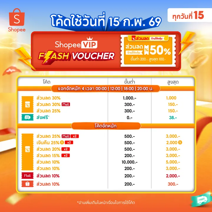 ฉลองวาเลนไทน์และเทศกาลกับโปรโมชัน Shopee Mid Month Sale 2.15 ครึ่งเดือน ลดแรง มีโปรโมชันจากแบรนด์ดังมากมาย พร้อมโค้ดส่วนลด ร้านโค้ดคุ้ม 25% และดีลเดือดลดสูงสุด 70% เมื่อจ่ายผ่าน SPayLater เตรียมเก็บโค้ดส่วนลดกันก่อนได้เลย แล้วรอช็อปพร้อมกันวันที่ 15 ก.พ. 2569 นี้เท่านั้น โค้ดไหนเด็ด ดีลไหนคุ้ม Shopee ได้รวบรวมมาให้แล้วติดตามได้ที่นี่