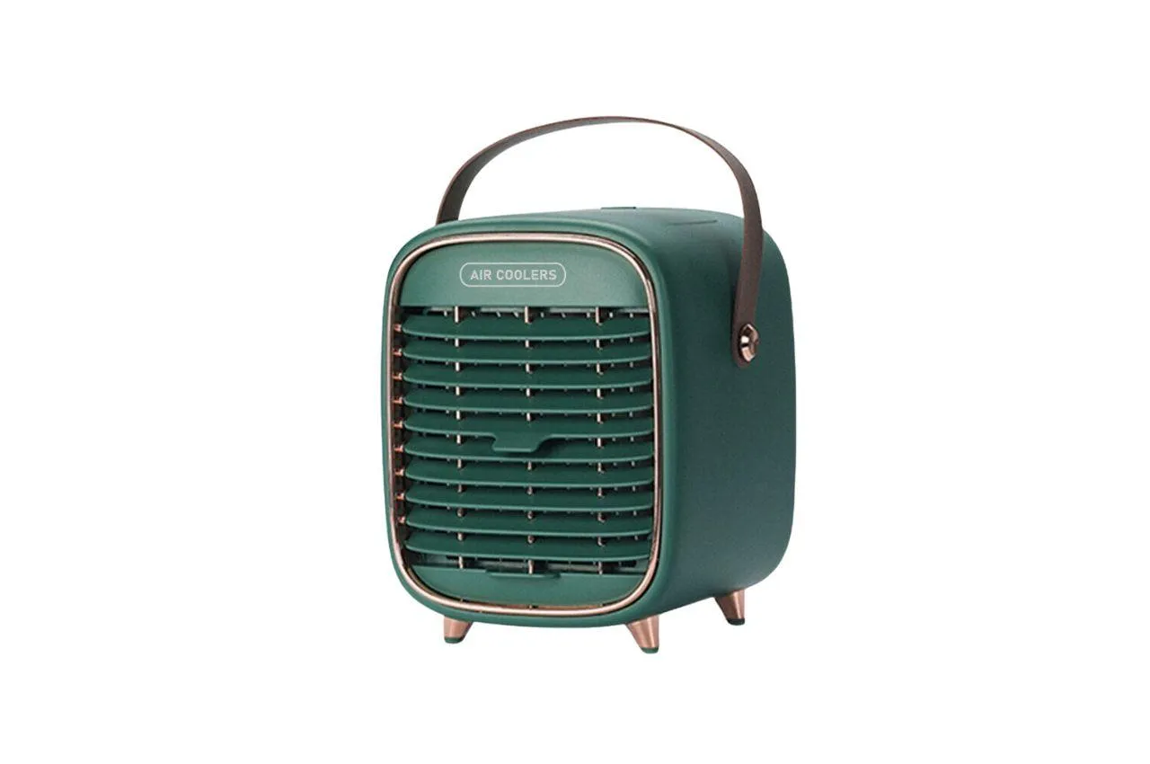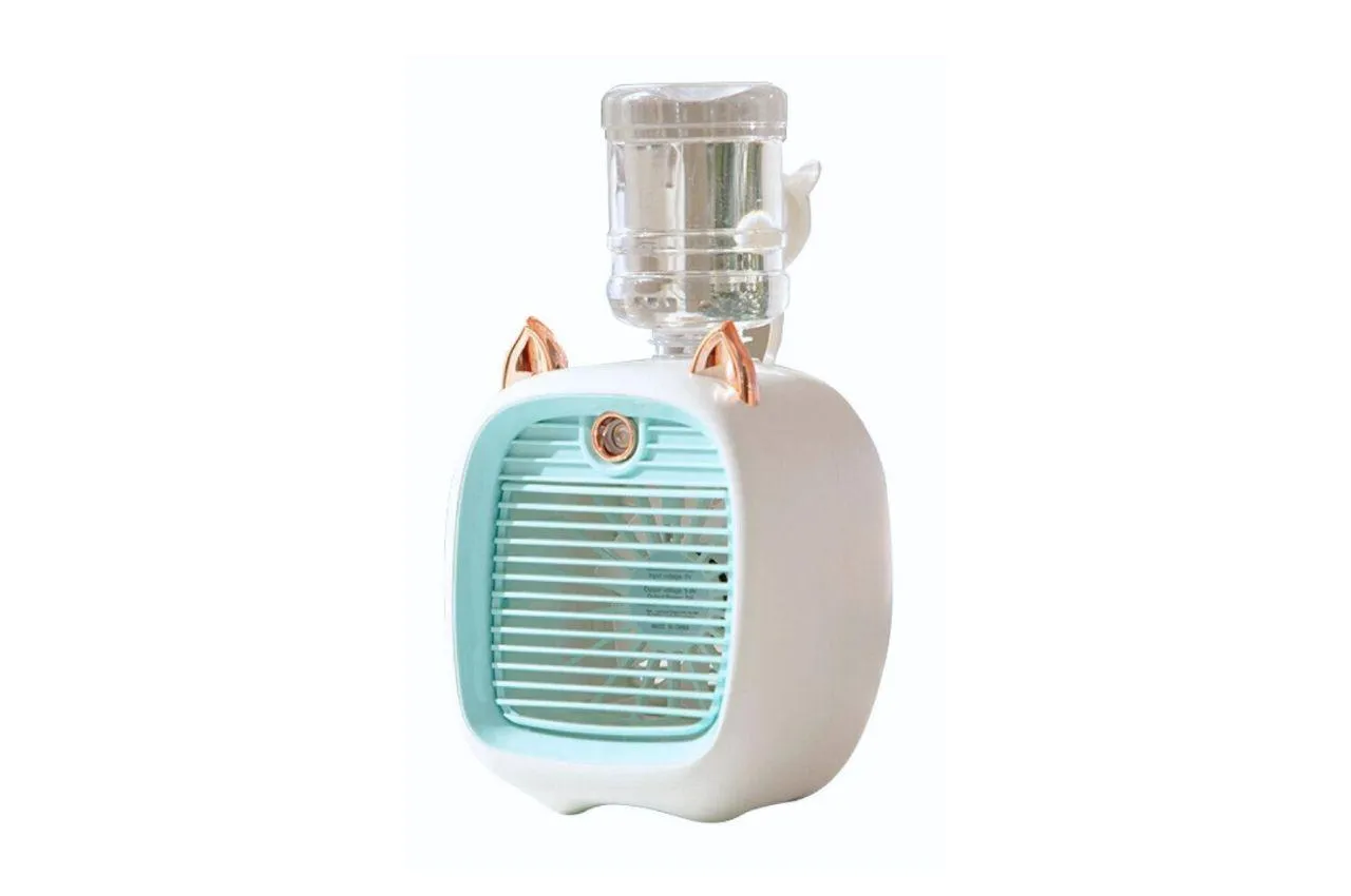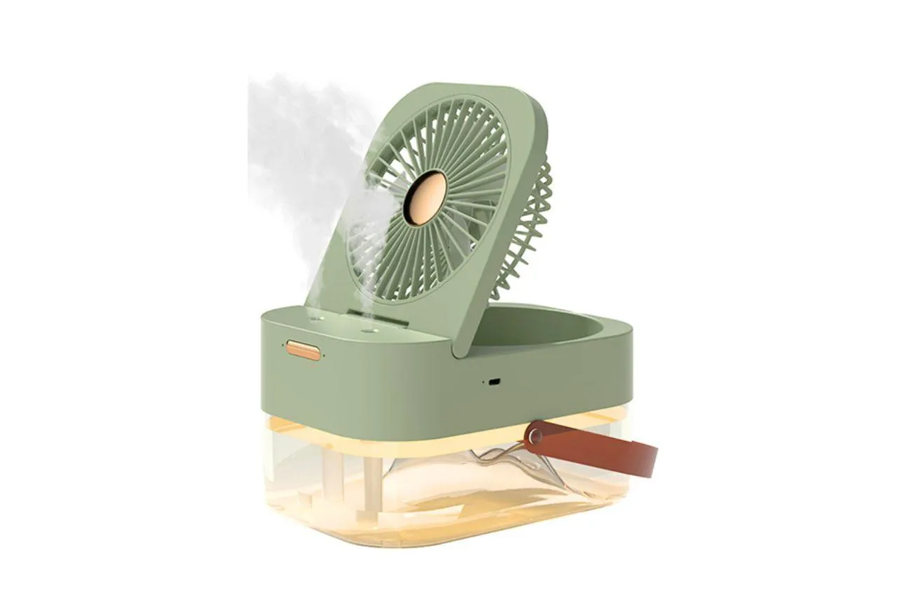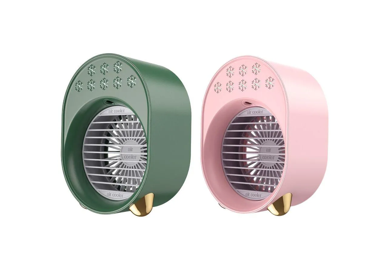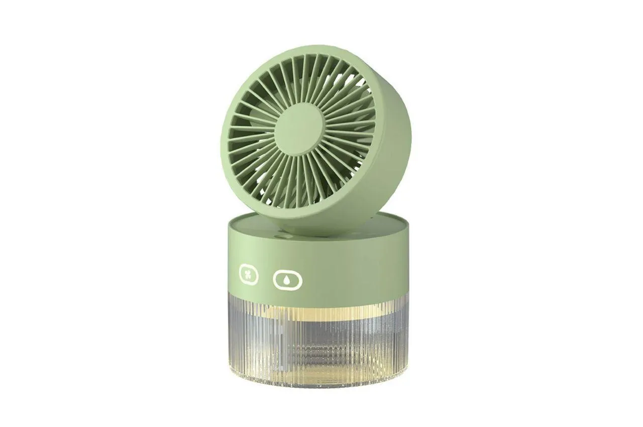 พัดลมไอน้ำขนาดเล็กที่มีให้เลือกทั้งสีเขียวเรียบหรู และสีชมพูสวยหวาน จากแบรนด์BASIKEสามารถปล่อยละอองน้ำ ซึ่งมีความละเอียดด้วย ‘นาโนสเปรย์’ มีส่วนช่วยให้อุณหภูมิลดลง 3-6 องศาเซลเซียสเมื่อใช้น้ำปกติ และมีส่วนช่วยให้อุณหภูมิลดลง 10-12 องศาเซลเซียสเมื่อเติมน้ำแข็ง ตัวถังบรรจุน้ำได้ 200 มิลลิลิตร