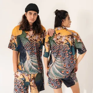 เสื้อฮาวายผู้ชายยี่ห้อนี้มาในลวดลายนกยูงสีเขียว ตัดกับสีโทนส้มเบจที่ให้ความรู้สึกสดใสรับฤดูร้อน มาพร้อมกับความเชื่อที่ว่านกยูงเป็นสัญลักษณ์ของความร่ำรวย โชคดี และความสมบูรณ์ของชีวิต ตัดเย็บจากเนื้อผ้าคุณภาพดี มีความพลิ้วไหว ระบายอากาศ และนุ่มสบาย ด้านหน้ามีกระเป๋าสำหรับใส่ของ ประดับด้วยกระดุมไม้สีเข้ม มีให้เลือกซื้อแบบเสื้ออย่างเดียว หรือซื้อเป็นชุดเซตก็ได้
