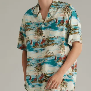 เสื้อฮาวายผู้ชายแขนสั้นจาก Mc Jeans มาในลวดลายต้นมะพร้าวและทะเลต่อกันเป็นแพตเทิร์นแบบ Seamless เนื้อผ้าเป็นโทนสีครีม ตัดเย็บจากผ้าเรยอน 100% สัมผัสนุ่มลื่น ใส่สบาย ไม่ระคายผิว ด้านหน้ามีกระเป๋า แต่งด้วยกระดุมและ Rivet ที่เป็นเอกลักษณ์ของแบรนด์ มีให้เลือกทั้งหมด 5 ไซส์ คือ S, M, L, XL และ XXL เป็นแบบ Unisex ใส่ได้ทั้งผู้ชายและผู้หญิง