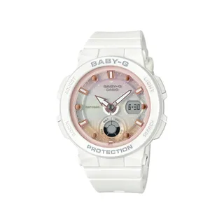 นาฬิกา Casio BABY-G รุ่นนี้จากซีรีส์ Beach Traveler มาในธีมชายหาดในช่วงฤดูร้อน หน้าปัดมาในโทนสีพาสเทล ตัวบอกเวลาและเข็มนาฬิกาได้แรงบันดาลใจการออกแบบจากหางเสือและสมอเรือ นอกจากนี้ยังมีไฟแบ็กไลต์เป็นแสงนีออน ช่วยให้ดูเวลาได้ง่ายในตอนกลางคืน นอกจากนี้นาฬิการุ่นนี้ยังสามารถดูเวลาได้ทั้งแบบอนาล็อกและดิจิทัล กันน้ำได้ลึก 100 เมตร และใช้จับเวลา นับเวลาถอยหลังและตั้งปลุกได้