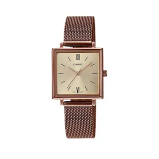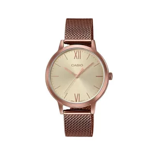 นาฬิกาสีโรสโกลด์อีกหนึ่งรุ่นจาก Casio ที่น่าสนใจไม่แพ้กัน ตัวเรือนขนาดเล็กและเป็นทรงกลม เหมาะกับสาวๆ ที่ข้อมือเล็ก ใส่แล้วพอดีกับข้อมือ หน้าปัดนาฬิกาเป็นสีทองตกแต่งด้วยตัวเลขโรมันและเข็มนาฬิกาสีโรสโกลด์ สายนาฬิกาเป็นโลหะตาข่าย ดีไซน์เรียบหรู สามารถใส่ได้หลายโอกาส และยังกันน้ำได้อีกด้วย