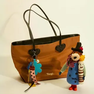 กระเป๋าจากแบรนด์ Tagi. รุ่นนี้เป็น Tote Bag ทรงเรียบง่ายแต่โดดเด่นด้วยดีเทลตัวยึดสายกระเป๋าเป็นรูปหัวใจที่ช่วยเพิ่มความน่ารักได้เป็นอย่างดี กระเป๋าผลิตจากหนัง PU และไนลอน มีความแข็งแรง ด้านในแบ่งช่องใส่ของไว้เป็นสัดส่วน สามารถใส่ของได้เยอะ และหยิบของได้สะดวก กระเป๋ามีให้เลือก 4 สี คือ สีดำ สีน้ำตาล สีเขียว และสีแดง