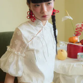 เสื้อตรุษจีนสุดคิ้ว รุ่น Anqiu Top จากแบรนด์ Hanna.bgg ตัดเย็บจากผ้าชีฟอง ตัวผ้ามีลายนูนรูปดอกไม้ดูมีมิติ มาพร้อมซับในแบบทั้งตัว ใส่แล้วไม่โป๊ และมีซิปซ่อนบริเวณข้างลำตัว มีให้เลือก 2 สี คือ สีครีมและสีชมพู ตั้งแต่ไซส์ S จนถึง L และเนื่องจากเป็นผ้าชีฟอง ทางร้านแนะนำให้แช่น้ำยาปรับผ้านุ่มนานกว่าปกติ เพื่อให้สวมใส่สบายมากยิ่งขึ้น