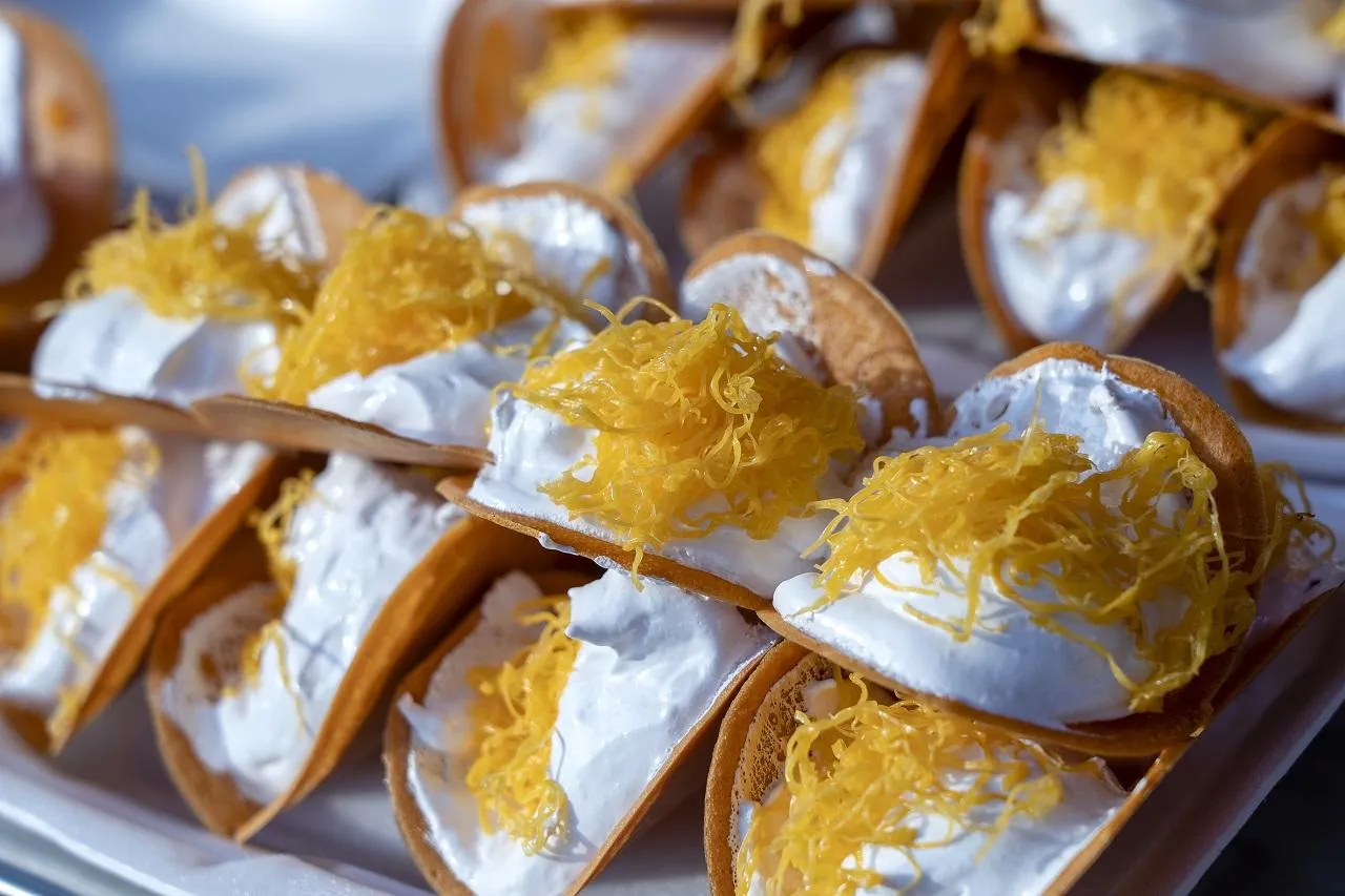 ขนมเบื้อง เป็นขนมไทยโบราณที่นิยมรับประทานกันถึงทุกวันนี้ วิธีทำต้องแยกทำไส้กับแป้ง โดยการตอกไข่เป็ดแล้วนำไข่แดงไปทำไส้นม และไข่ขาวผสมครีมออฟทาทาร์เพื่อทำครีมทาบนหน้าแป้งที่ตีเป็นวงบนกระทะ จากนั้นใช้ไม้ทำขนมตักขึ้นมาพับไว้เพื่อเสิร์ฟ