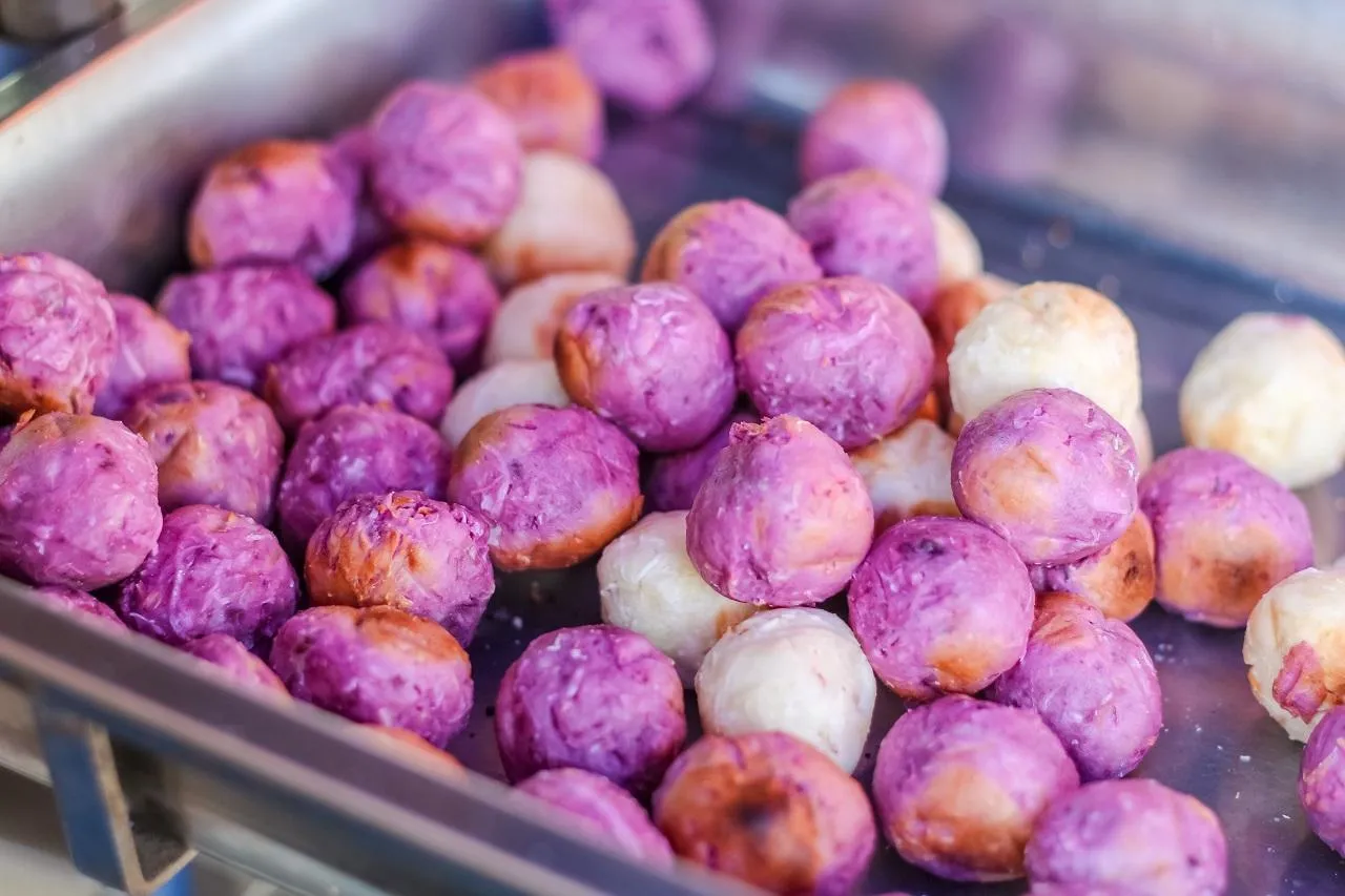 ขนมมันม่วง เป็นขนมไทยร่วมสมัย ที่เกิดจากการนำวัตถุดิบที่กำลังเป็นที่นิยมมาใช้กรรมวิธีทำแบบขนมไทย ทั้งการนำไปผสมแป้งนึ่ง โรยด้วยมะพร้าวขูด หรือนำมาปั้นเป็นก้อนแล้วปิ้งบนเตา หรือนำไปทำมันม่วงบวดด้วยสูตรเดียวกับฟักทองบวด เผือกบวด ก็อร่อยไม่แพ้กัน