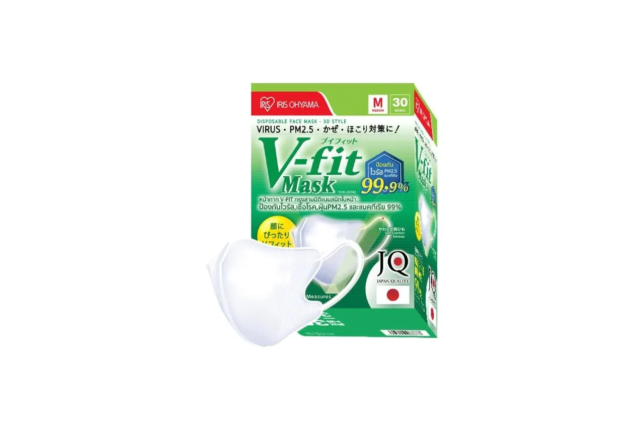 หน้ากากอนามัยจากแบรนด์ Iris Ohyama รุ่น V-Fit มาตรฐานจากประเทศญี่ปุ่น รูปทรงแบบ Fit-V Desigh กระชับ รับกับจมูกและช่วงคางได้ดี ทำให้ใบหน้าดูเรียวมากขึ้น มาพร้อมสายรัดนุ่ม ทั้งยังเป็นทรงโค้งมน ใส่สบาย ไม่บาดหู