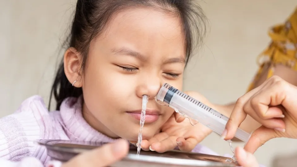 ก้มหน้า โน้มตัวไปข้างหน้า เพื่อไม่ให้น้ำเกลือไหลเปรอะเสื้อผ้า ฉีดน้ำเกลือซ้ำจนกว่าจะรู้สึกสบายตัว