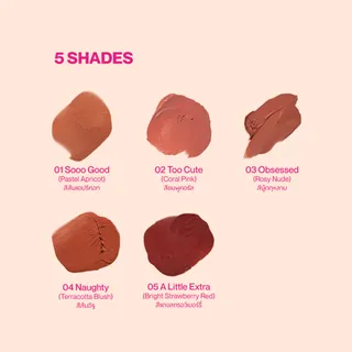 ครีมบลัชเนื้อนุ่ม พิกเมนต์สีแน่น เกลี่ยง่าย ให้ฟินิชแบบแมตต์ มีส่วนผสมของ Squalene และวิตามิน อี ช่วยบำรุงผิวให้ชุ่มชื้น สามารถใช้เพิ่มสีสันได้ทั้งกับตา แก้ม และปาก แพ็กเกจสีเหลืองน่ารักสดใสมาพร้อมกระจกในตัว มีให้เลือกทั้งหมด 5 สี คือ สี 01 Sooo Good, สี 02 Too Cute, สี 03 Obsessed, สี 04 Nauhty และ สี 05 A Little Extra