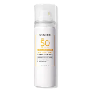 สเปรย์กันแดดจาก SKINTIFIC สูตร All Day Light Sunscreen Mist SPF 50 PA++++ สเปรย์กันแดดตัวดังจาก TikTok มีละอองละเอียดขนาดเพียง 0.1 นาโนเมตร ให้สัมผัสที่บางเบา สบายผิว พ่นทับเครื่องสำอางได้ ไม่ทำให้เครื่องสำอางเยิ้ม ปกป้องผิวจากแสงแดดด้วย SPF 50 PA++++ มาพร้อมกับส่วนผสมต่างๆ เช่น UV Pearl, Ceramide, Centella มีส่วนช่วยในการปกป้องผิวจากแสงแดด ชะลอการเกิดริ้วรอยจากรังสี UV ใช้ได้ทั้งผิวหน้า-ผิวภาย