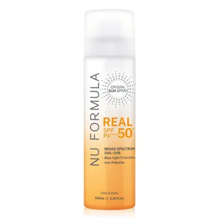 Nu Formula Crystal Sun Spray Real SPF50+ PA++++ สเปรย์กันแดดอีกหนึ่งยี่ห้อที่อัดแน่นด้วยสารกันแดดปกป้องผิว มาพร้อมกับนวัตกรรมของ Nu Formula โดยเฉพาะ ละอองกันแดดมีอณูเล็ก บางเบา พ่นแล้วหน้าไม่มันเยิ้ม เป็นสูตรกันน้ำ ช่วยมอบความสดชื่นให้ผิวหน้า สามารถใช้เติมได้ระหว่างวัน โดยไม่ทำให้อุดตันรูขุมขน ใช้พ่นเป็นสเปรย์ล็อกเมกอัพได้