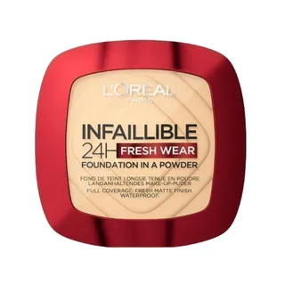 L’Oreal Infaillible 24H Fresh Wear Foundation In A Powder แป้งแบบไฮบริด ให้การปกปิดเสมือนรองพื้นแต่ยังคงให้สัมผัสที่สบายผิว แป้งอณูเล็กละเอียด สามารถกลืนไปกับผิวได้อย่างดี มีคุณสมบัติในการคุมมัน ทนน้ำ ทนเหงื่อ ติดทนตลอดวัน ไม่เป็นคราบและไม่ดรอประหว่างวัน มีให้เลือกเฉดสีที่เหมาะกับผิวคนไทย