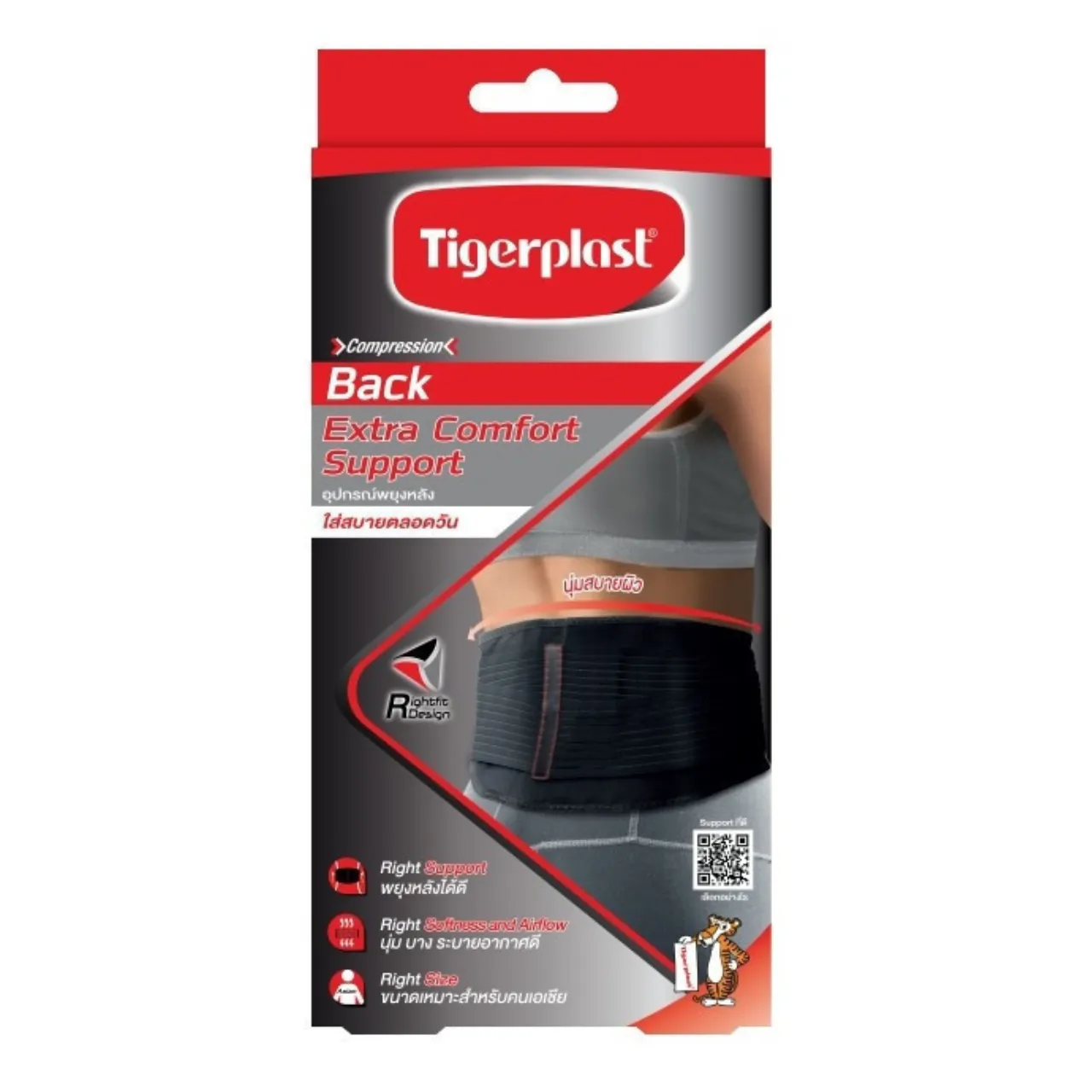 เข็มขัดพยุงหลัง Tigerplast Extra Comfort Back Support อุปกรณ์ช่วยพยุงหลังที่ออกแบบมาให้มีสัมผัสนุ่มสบายผิว ระบายอากาศได้ดี ผลิตจากวัสดุที่มีความยืดหยุ่นสูง มาพร้อมกับแรงรัดที่สม่ำเสมอ มีแกนช่วยพยุงหลัง 4 เส้น เป็นเข็มขัดพยุงหลังที่ถูกดีไซน์มาตามสรีระของคนเอเชียโดยเฉพาะ