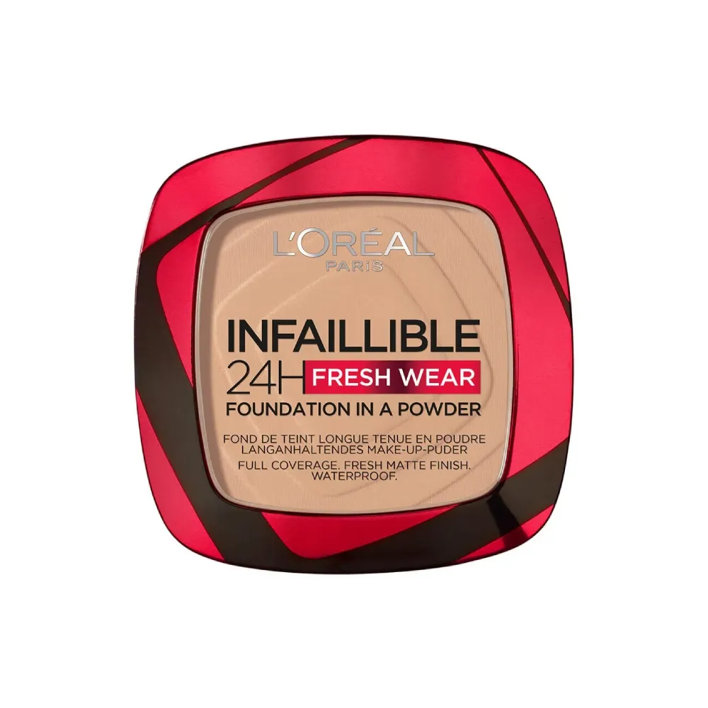 แป้งผสมรองพื้น L'Oréal Paris รุ่น Infallible 24H มาพร้อมเทคโนโลยี HYBRID LIQUID-IN-POWDER ให้การปกปิดผิวได้เรียบเนียนเหมือนรองพื้น แต่เนื้อแป้งมีสัมผัสบางเบา แนบสนิท และกลมกลืนไปกับผิวหน้า ช่วยให้ผิวดูสวยเป็นธรรมชาติ ไม่หนา ไม่ตกร่อง และมีส่วนช่วยควบคุมความมันระหว่างวัน กันน้ำ กันเหงื่อ และไม่ทำให้ผิวหน้าดรอประหว่างวัน มีให้เลือก 6 เฉดสี