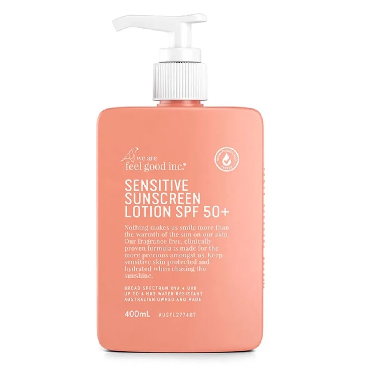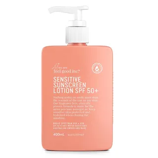 ครีมกันแดด SPF50+ จาก We Are Feel Good Inc.: Sensitive Sunscreen Lotion SPF50+ ผลิตขึ้นในประเทศออสเตรเลีย เป็นสูตรที่มีความอ่อนโยนสูง เหมาะกับคนที่มีผิวแพ้ง่าย ปกป้องผิวได้จากทั้ง UVA และ UVB ผสานไปกับสารสำคัญอย่าง Beewax, Vitamin E และว่านหางจระเข้ ที่มอบความชุ่มชื้นและบำรุงผิวได้ในคราวเดียว