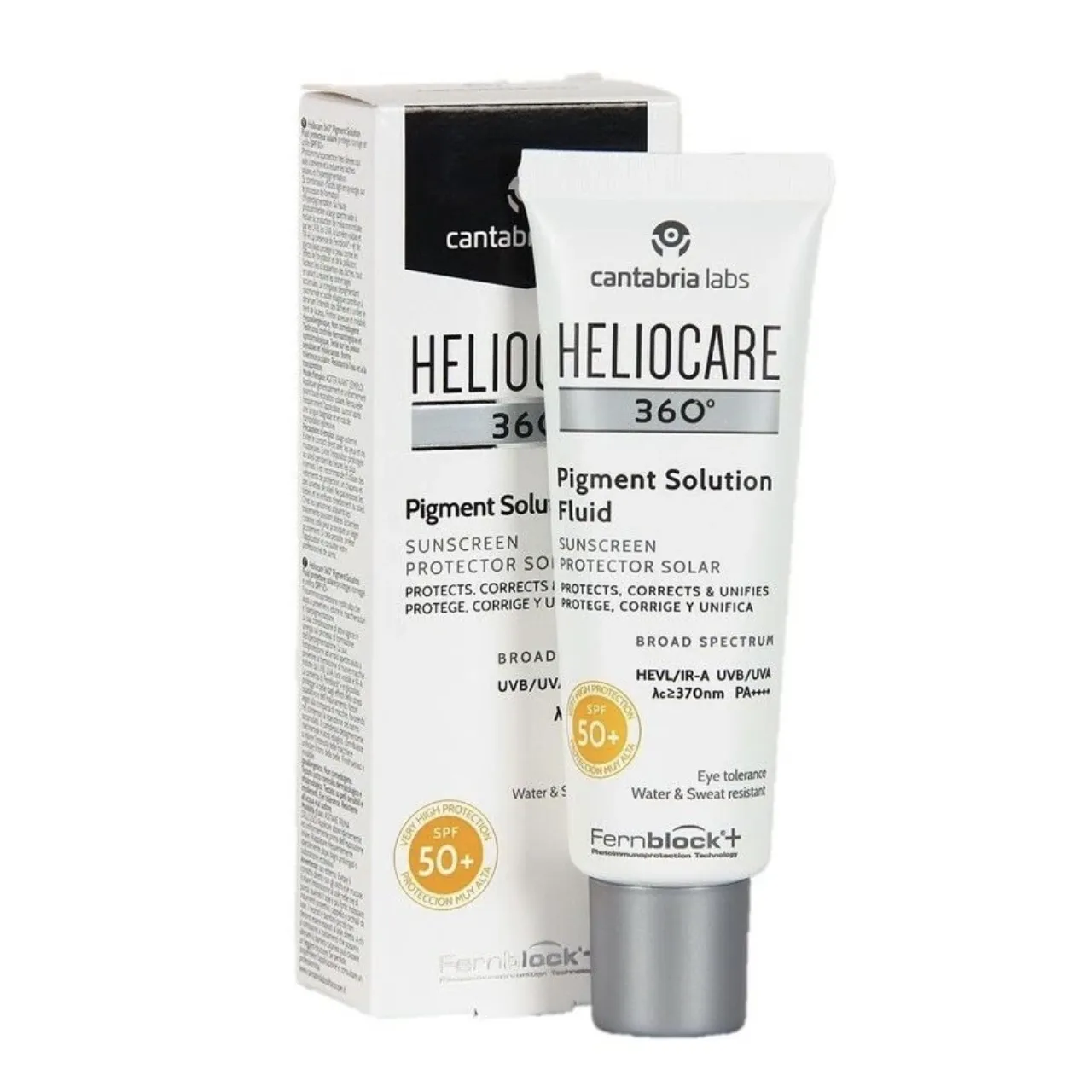 Heliocare 360º Pigment Solution Fluid SPF 50+ ครีมกันแดดที่มีค่ากันแดดมากถึง SPF50+ มีส่วนช่วยในการป้องกันผิวหน้าที่อาจถูกทำร้ายได้จากรังสีต่างๆ เช่น UVA, UVB, Infrared รวมถึงแสงจากหลอดไฟ จอคอม และจอโทรศัพท์อีกด้วย เป็นตัวช่วยในการรับมือกับฝ้า กระ จุดด่างดำ ได้เป็นอย่างดี
