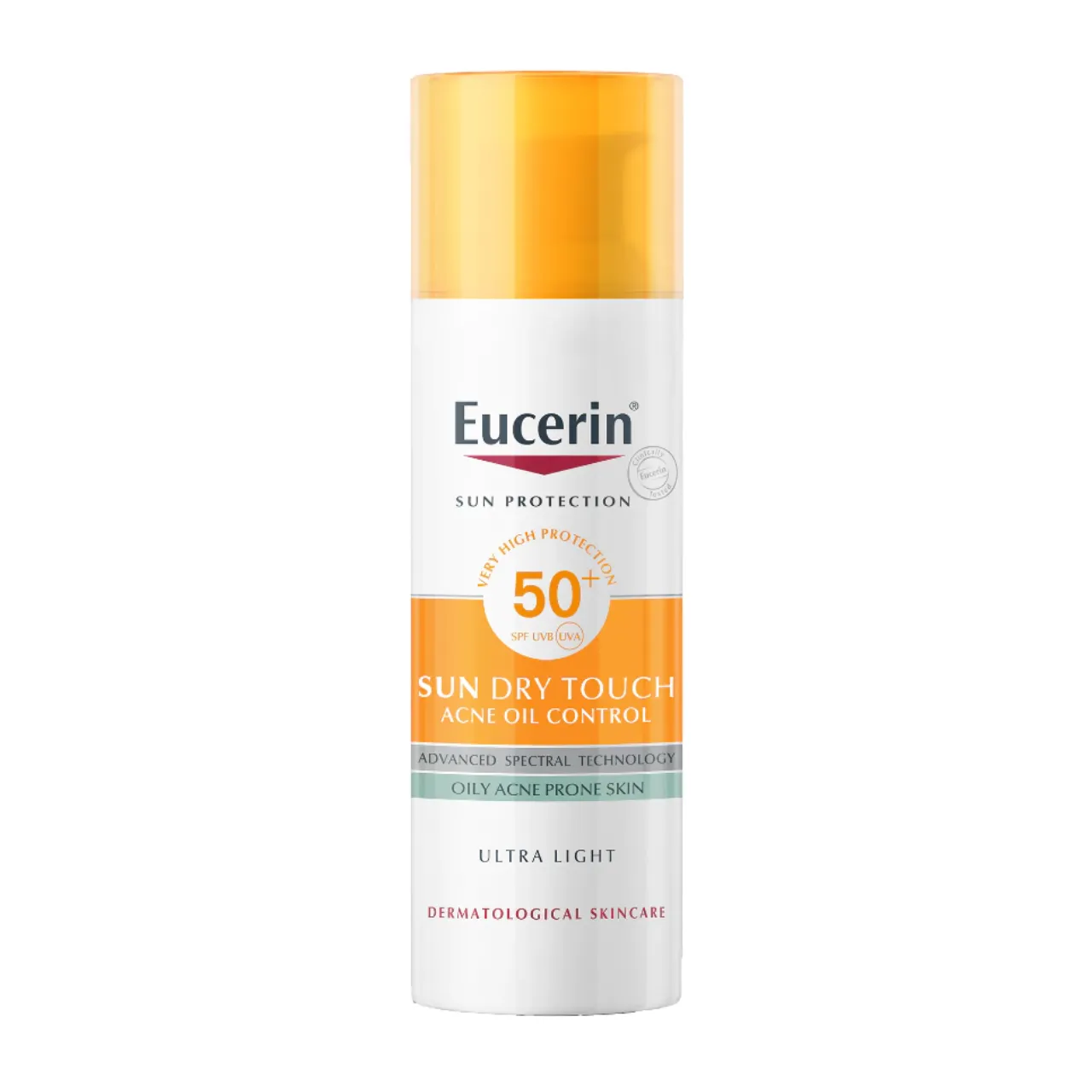 Eucerin Sun Dry Touch Acne Oil Control SPF50+ PA++++ ครีมกันแดด SPF50+ อีกหนึ่งยี่ห้อที่ได้รับความนิยม อุดมไปด้วยสารสำคัญไม่ว่าจะเป็น Broad Spectrum Oxidant Filter มีส่วนช่วยในการปกป้องผิวหน้าจากรังสีทั้ง UVA, UVB และแสงสีฟ้า มาพร้อมกับ L-Carnitine ช่วยในการปรับสมดุลการผลิตความมันบนผิวหน้า และควบคุมความมันส่วนเกิน เนื้อสัมผัสเป็นแบบดรายทัช บางเบา ซึมเร็ว ไม่ทิ้งคราบ เหมาะกับคนที่มีผิวมันและผิวเป็นสิวง่าย