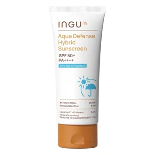 กันแดดแบรนด์ไทยอย่าง INGU Aqua Defense Hybrid Sunscreen SPF 50+ PA++++ Very Water Resistant เป็นครีมกันแดด SPF50+ ที่ช่วยในการปกป้องผิวหน้าได้อย่างดี มีคุณสมบัติการกันน้ำกันเหงื่อ ปกป้องผิวได้ทั้ง UVA, UVB และแสงสีฟ้า พร้อมปลอบประโลมผิวที่เผชิญแสงแดดระหว่างวัน