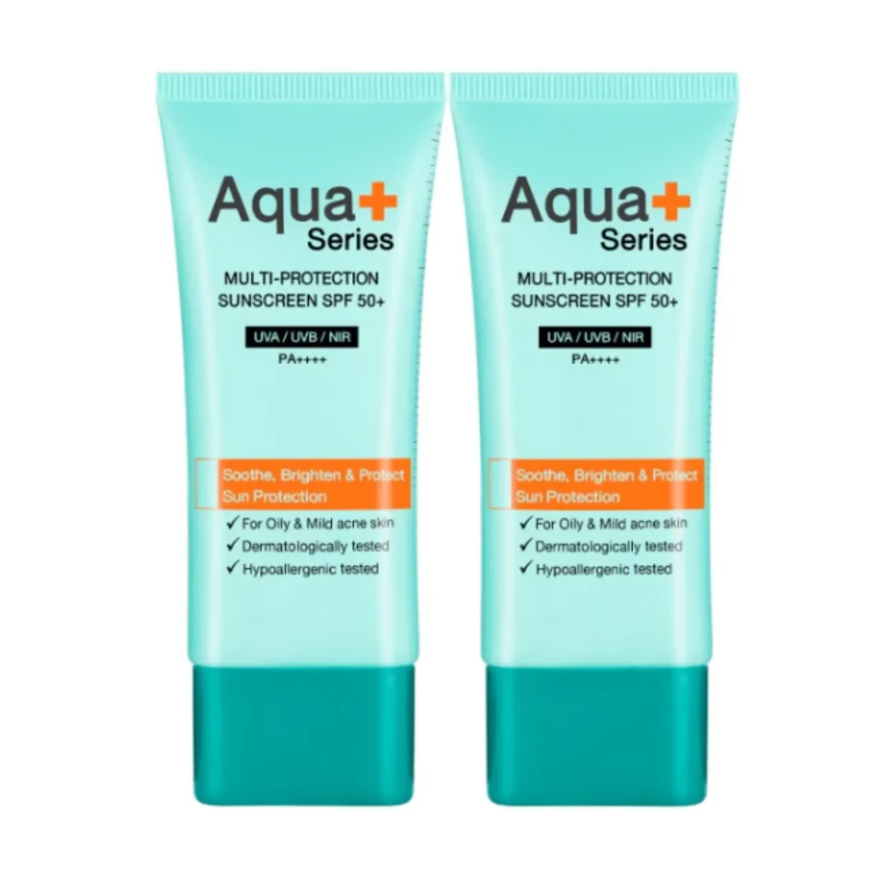 ครีมกันแดด SPF50+ อย่าง Aqua+ Series Multi-Protection Sunscreen SPF50+ PA++++ ถือเป็นครีมกันแดดที่คุ้มค่า สามารถใช้เป็นทางเลือกได้ทั้งการปกป้องผิวจากรังสี UVA, UVB, Infrared และการบำรุงผิวให้แลดูกระจ่างใส ควบคุมความมันส่วนเกิน และปกป้องโครงสร้างผิวให้แข็งแรง เหมาะกับผิวที่เป็นสิวง่าย หมองคล้ำ และผิวมัน
