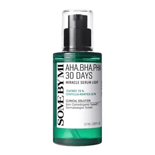 SOME BY MI AHA.BHA.PHA 30 Days Miracle Serum Light เซรั่มสัญชาติเกาหลีมาพร้อมกับสารสกัดจากธรรมชาติ ไม่ว่าจะเป็นน้ำใบทีทรี พลูคาว และใบบัวบก มีส่วนช่วยในการปลอบประโลมผิวและบำรุงผิวให้ชุ่มชื้นได้อย่างล้ำลึก และยังมีสารสกัดอย่าง AHA, BHA และ PHA ที่ช่วยผลัดเซลล์ผิวอย่างอ่อนโยน ขจัดความมันส่วนเกินบนผิวหน้าโดยไม่ทำให้รู้สึกระคายผิว เซรั่มมีเนื้อสัมผัสที่บางเบา ซึมไว ไม่ทิ้งความเหนอะหนะบนผิวหน้า
