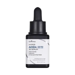 เซรั่มอย่าง ISNTREE Hyper Acid4 AHA BHA PHA LHA 30 Serum เซรั่มผลัดเซลล์ผิวแบบล้างออก อุดมไปด้วยกรดต่างๆ ที่เป็นประโยชน์ต่อผิวถึง 4 ชนิด ได้แก่ AHA, BHA, PHA และ LHA มีส่วนช่วยในการขจัดเซลล์ผิวเสื่อมสภาพได้อย่างหมดจด พร้อมช่วยควบคุมความมันส่วนเกินบนใบหน้า นอกจากนี้ยังมีส่วนผสมของพีทวอเตอร์ ที่ช่วยเพิ่มความยืดหยุ่นของผิว ทำให้ผิวแลดูอ่อนเยาว์และอวบอิ่มอย่างเป็นธรรมชาติ แนะนำให้ใช้ในขั้นตอนการดูแลผิวช่วงกลางคืน