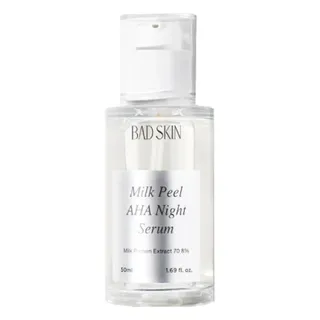ไนต์เซรั่มอีกหนึ่งยี่ห้อจากเกาหลีอย่าง BADSKIN Milk Peel AHA Night Serum ตัวช่วยในการผลัดเซลล์ผิวอย่างอ่อนโยนด้วยสารสกัดอย่าง AHA, BHA และ PHA มีส่วนช่วยในการขจัดเซลล์ผิวเสื่อมสภาพ ทำให้ผิวหน้าแลดูเรียบเนียนสม่ำเสมอ ให้ผิวดูกระจ่างใสตามธรรมชาติ นอกจากนี้ยังอุดมไปด้วยสารสกัดโปรตีนจากนม ที่ช่วยบำรุงผิวหน้า พร้อมเติมความชุ่มชื้นให้กับผิว