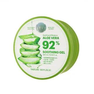 เจลว่านหางจระเข้แบบกระปุกจาก NATURE REPUBLIC แบรนด์เครื่องสำอางสัญชาติเกาหลี มีสารสกัดจากใบว่านหางจระเข้ถึง 92% ช่วยปลอบประโลมผิว ลดระคายเคือง และฟื้นบำรุงผิวให้แข็งแรง เนื้อเจลมีสัมผัสบางเบา ให้ความรู้สึกเย็นสบายผิว ไม่เหนอะหนะ สามารถใช้ได้ทั้งกับผิวหน้าและผิวกาย และใช้บำรุงเส้นผมได้ด้วย