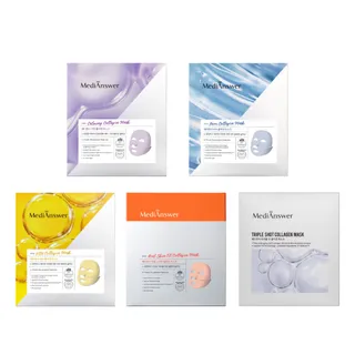 MEDIANSWER Collagen Mask มาสก์ไฮโดรเจลที่มียอดขายเป็นอันดับ 1 ใน Olive Young ร้านดรักสโตร์ชื่อดังของเกาหลีใต้ แผ่นมาสก์เป็นเนื้อเจลสัมผัสนุ่ม อ่อนโยน แนบสนิทไปกับผิวได้ดี และมีส่วนผสมของคอลลาเจนสูงถึง 83% ช่วยเพิ่มความยืดหยุ่นให้กับผิว มีให้เลือก 5 สูตร ดังนี้