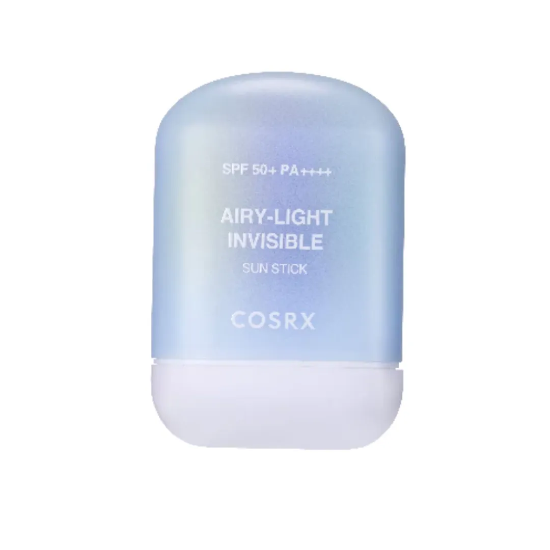 กันแดดสติ๊ก COSRX สูตร Airy-Light Invisible Sun Stick SPF50+ PA++++ กันแดดแบบแท่งเนื้อบางเบา ให้ความรู้สึกสบายผิว มีเทคโนโลยีที่ช่วยกันเหงื่อ คุมมัน เหมาะกับคนเป็นสิว ผสานไปด้วยสารสกัดเพื่อประสิทธิภาพการกันแดดจากทั้ง Zinc PCA และ Niacinamide ใช้งานง่าย ทาแล้วไม่ทิ้งคราบ ไม่ทำให้หน้าดูมันวาว
