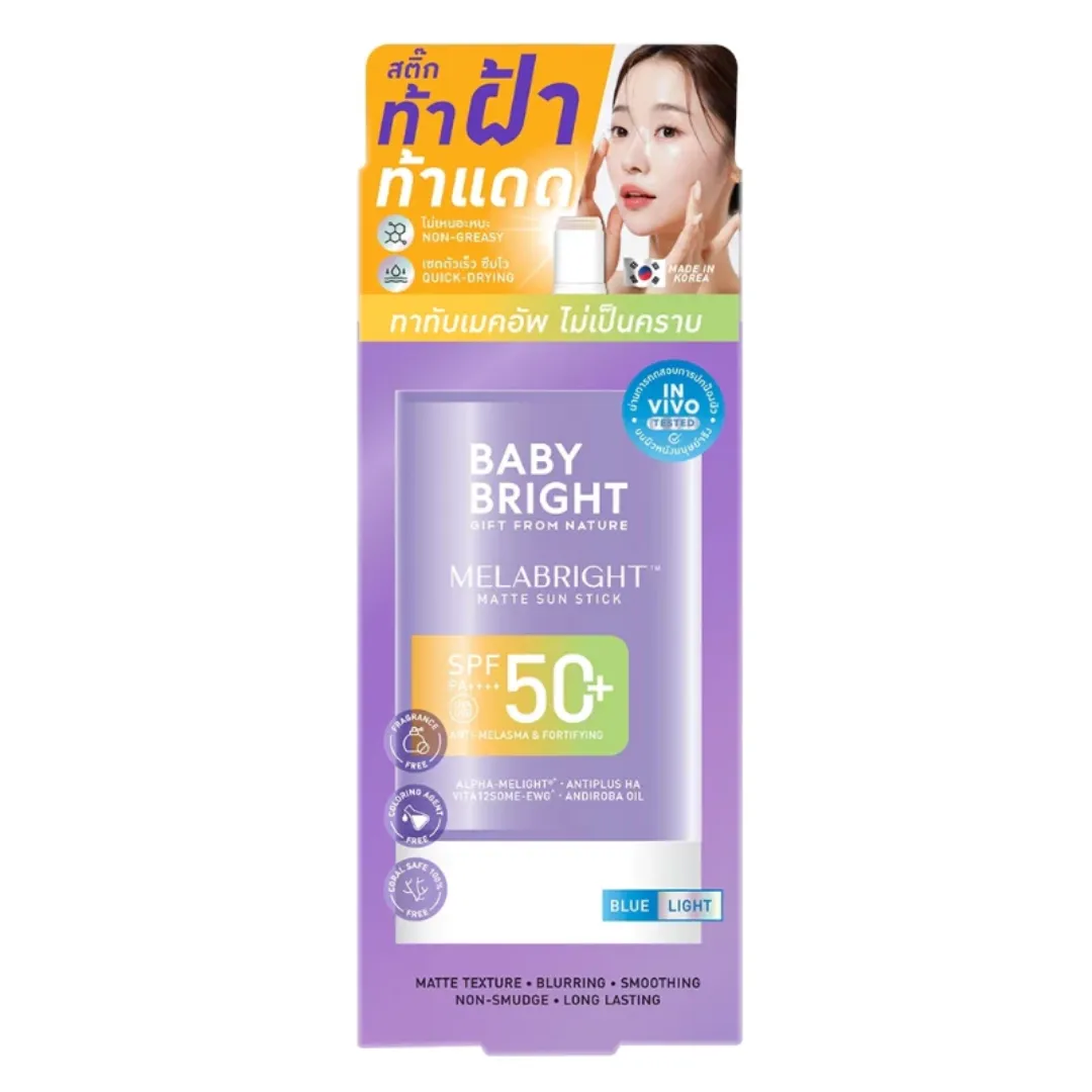 Baby Bright Melabright Matte Sun Stick SPF50+ PA++++ กันแดดสติ๊กเนื้อแมตต์ สัมผัสบางเบา เกลี่ยง่าย ช่วยเบลอผิวให้ดูเรียบเนียน ใช้ลงเป็นเมกอัพเบสได้โดยไม่ต้องรอให้เซตตัว สามารถลงทับเมกอัพได้ นอกจากจะบำรุงผิวแล้ว ยังมีส่วนช่วยในการปกป้องผิวจากทั้ง UVA, UVB และแสงสีฟ้า