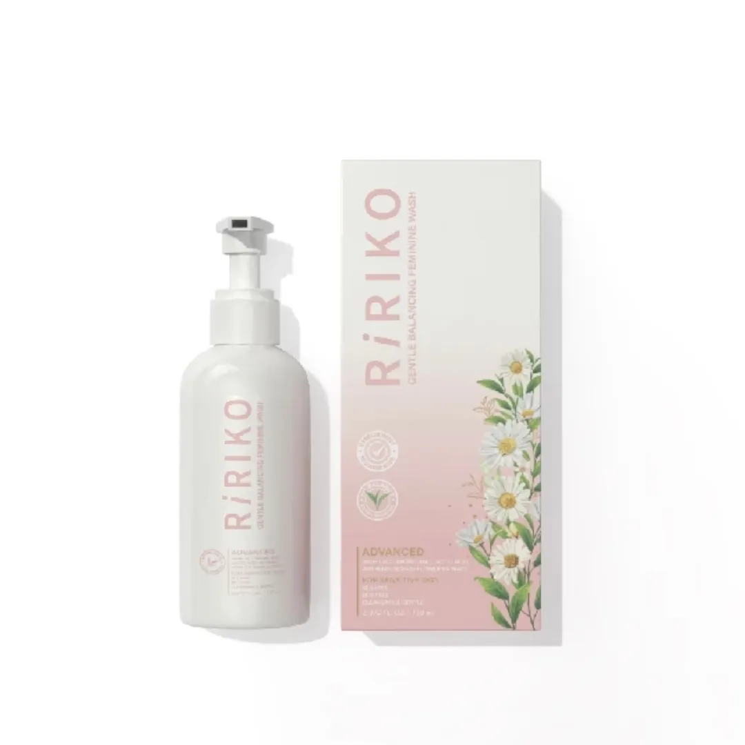 RIRIKO Gentle Balancing Feminine Wash น้ำยาล้างจุดซ่อนเร้น สูตร pH Balance อุดมด้วยสารสกัดจากธรรมชาติ เช่น น้ำผึ้ง, ยางไม้เมอร์, ดอกคาโมมายล์ และไลเคนเครา พร้อมทั้งมีส่วนผสมของสารให้ความชุ่มชื้นแก่ผิวอีกมากมาย มีคุณสมบัติช่วยปลอบประโลมผิวและยับยั้งกลิ่นไม่พึงประสงค์ หอมสดชื่นด้วยกลิ่นของชาเขียวและคาโมมายล์
