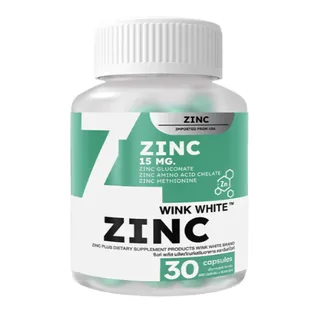 WINK WHITE ZINC อาหารเสริม Zinc อีกหนึ่งยี่ห้อที่โดดเด่นด้วยซิงก์ 3 ฟอร์ม ไม่ว่าจะเป็น Zinc Gluconate, Zinc Methionine และ Zinc Amino Acid ที่มีส่วนช่วยในการบำรุงร่างกายแบบองค์รวม ทั้งผิว เส้นผม เล็บ เสริมภูมิคุ้มกัน และเสริมการดูดซึมสารอาหารที่จำเป็นต่อร่างกาย ผสมเข้ากับสารสกัดอื่นๆ เช่น ใบบัวบก พลูคาว และโรสฮิป