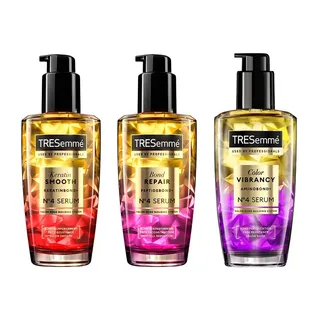 TRESemmé Hair Serum No.4 เซรั่มบำรุงผมเนื้อบางเบา ซึมเข้าสู่เส้นผมได้อย่างรวดเร็ว มอบกลิ่นหอมติดผม มีส่วนช่วยฟื้นบำรุงเส้นผมอย่างล้ำลึก ให้เส้นผมแข็งแรง ดูสุขภาพดี ลดปัญหาผมเสีย จากการโดนความร้อน ทำสีผม ดัดผม หรือยืดผม มีให้เลือก 3 สูตร ตอบโจทย์ผู้ที่มีปัญหาผมที่แตกต่างกัน