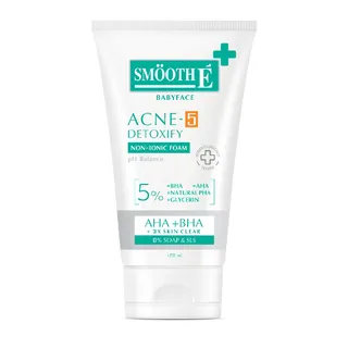 โฟมล้างหน้าลดสิว Smooth E ประกอบด้วย PHA, AHA, BHA, VIT E และ Chamomile Essential Oil มีส่วนช่วยจัดการปัญหาสิวลงลึกถึงต้นเหตุของการเกิดสิว ไม่ว่าจะเป็นการผลัดเซลล์ผิว, กำจัดสิ่งสกปรกที่อุดตันรูขุมขน, ขจัดความมัน หรือลดการสะสมของแบคทีเรีย และยังเป็นสูตรอ่อนโยน ปราศจากสารก่อการระคายเคือง 5 ชนิด ได้แก่ SLS, Oil, Alcohol, Soap และ Silicone