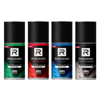เซ็ตโรลออนจาก ROMANO อัดแน่นด้วยผลิตภัณฑ์ระงับกลิ่นกายกลิ่นยอดนิยม ที่มีคุณสมบัติช่วยควบคุมเหงื่อได้ยาวนาน 48 ชม. ในเซ็ตมีทั้งหมด 4 กลิ่นดังนี้