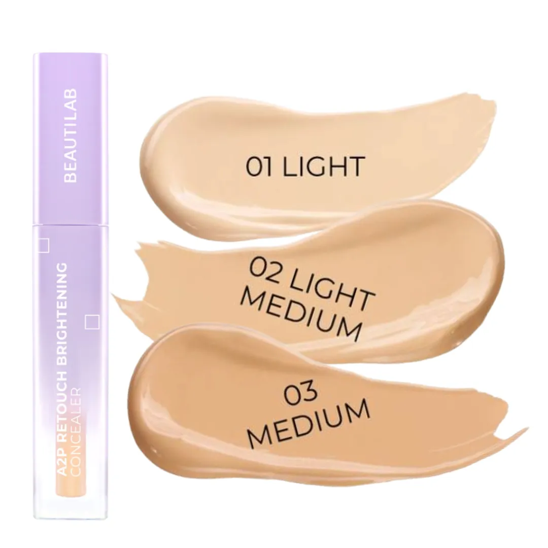 BEAUTILAB A2P Retouch Brightening Concealer คอนซีลเลอร์เนื้อ Semi-Matte มอบฟินิชผิวแบบแมตต์แต่ไม่แห้ง ปกปิดได้ในระดับปานกลาง-สูง ใช้สำหรับปกปิดจุดบกพร่องบนใบหน้า เช่น รอยสิว ฝ้า กระ จุดด่างดำ หรือปรับสภาพผิวให้แลดูกระจ่างใสและเรียบเนียนมากยิ่งขึ้น มาในเนื้อสัมผัสบางเบา เกลี่ยง่าย มีส่วนช่วยคงความชุ่มชื้นให้แก่ผิว ไม่ทำให้ผิวดูแห้งกร้าน กันน้ำกันเหงื่อได้ดี ไม่ทำให้เกิดคราบหรือตกร่องในระหว่างวัน