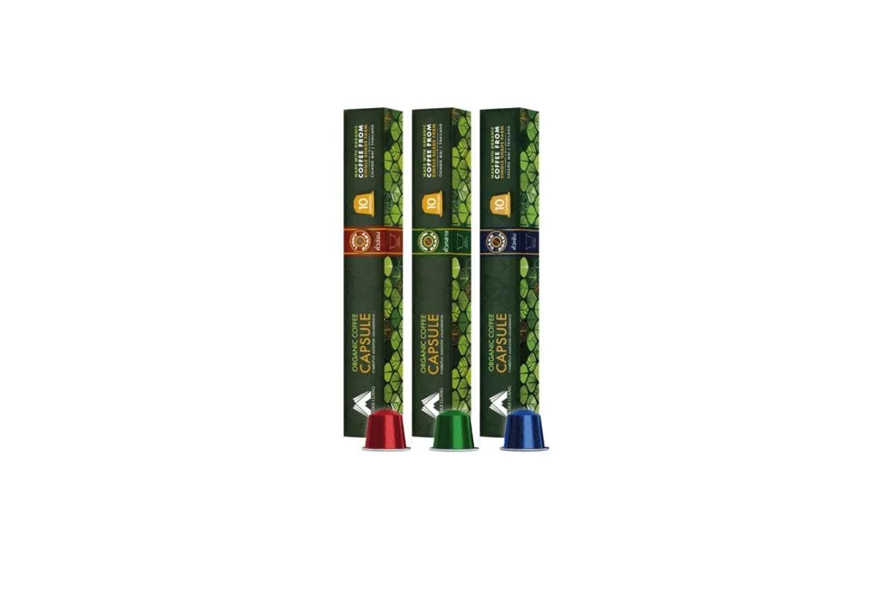 กาแฟแคปซูลออร์แกนิก ผลิตจากเมล็ดกาแฟอาราบิก้าที่ปลูกในไร่กาแฟอินทรีย์ม่อนดอยหลวง จังหวัดเชียงใหม่ ได้รับมาตรฐานเกษตรอินทรีย์สากล USDA NOP และ EU Organic Farming มีรสชาติกาแฟให้เลือกทั้งแบบคั่วอ่อนไปจนถึงคั่วเข้ม