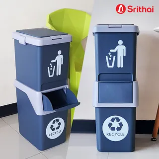 ถังขยะ Srithai Superware รุ่น M-70, M-71 ถังขยะคู่ซ้อน 2 ชั้น ถังด้านบนสำหรับทิ้งขยะทั่วไป ฝาเป็นแบบกดเปิด ความจุขนาด 20 ลิตร และถังด้านล่างสำหรับทิ้งขยะรีไซเคิลเช่น ขวดพลาสติก หรืออื่นๆ ฝาปิดเป็นแบบโยกเปิดจากด้านหน้า ความจุขนาด 25 ลิตร ถังวางซ้อน 2 ชั้น ใช้พื้นที่น้อยหรือจะถอดวางแยกเป็นถังคู่ก็ได้ตามต้องการ