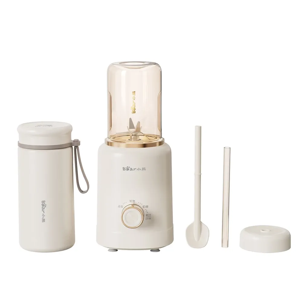 เครื่องปั่นน้ำผลไม้แบบพกพา Bear ตัวเครื่องมาพร้อมกับแก้วเก็บความเย็นขนาด 450 มล. ในเซ็ต โถปั่นสามารถปั่นได้ 350 มล. ปั่นได้ทั้งน้ำผลไม้ทั่วไปและน้ำผลไม้สมูตตี้ ใช้กำลังไฟในการปั่นที่ 300 วัตต์ สามารถปรับความแรงในการปั่นได้ตามต้องการ ใบมีดเป็นแบบ 6 แฉก ทำให้ปั่นได้ละเอียดมากยิ่งขึ้น ดีไซน์ภายนอกมีความมินิมอลน่าใช้