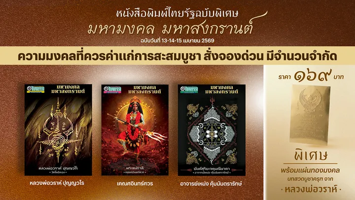 เพื่อเป็นการเสริมสิริมงคลต่อชีวิต เสริมโชคลาภบารมี ความสำเร็จและเมตตามมหานิยม พร้อมให้ผู้ที่ ศรัทธาได้เก็บสะสมเอาไว้ ดีไซน์ปกพิเศษ ฉบับวันที่ 13-14-15 เมษายน 2569 พร้อมแผ่นทองมงคล บทสวดบูชาครุฑจากหลวงพ่อวราห์ วัดโพธิทอง แผ่นทองเป็นแผ่นทองจาก หลวงพ่อวราห์ วัดโพธิทอง โดยตรง จัดทำขึ้นเพื่อให้ประชาชนได้ บูชาและเก็บเป็นสิริมงคล พิธีหรือขั้นตอนการจัดทำ เป็นไปตามการดำเนินการของทางวัด ภายในเล่มประกอบด้วย คู่มืออาราธนาและวิธีบูชามหามงคล และตัว QR Code ที่เป็นวีดีโอคือ เรื่องราวความเป็นมาของแต่ละศาสตร์ และความหมายของปกแต่ละชิ้นงาน
