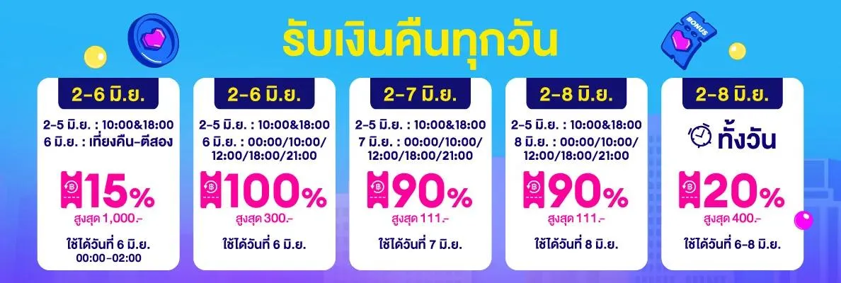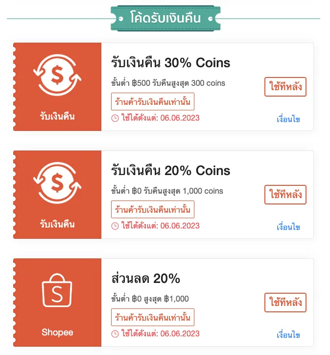 เก็บคูปองส่วนลดแล้ว แนะนำให้เก็บคูปองรับเงินคืนด้วย เพราะเงินคืนที่ได้รับนำไปใช้เป็นส่วนลดสำหรับช็อปปิ้งครั้งถัดไปได้ สำหรับแคมเปญนี้ Lazada แจกคูปองรับเงินคืนสูงสุดถึง 100% ซื้อขั้นต่ำ 99 บาท รับเงินคืนสูงสุด 300 บาท โดยเริ่มแจกตั้งแต่วันที่ 2 มิ.ย.- 5 มิ.ย. 2566 เวลา 10.00 และ 18.00 น.