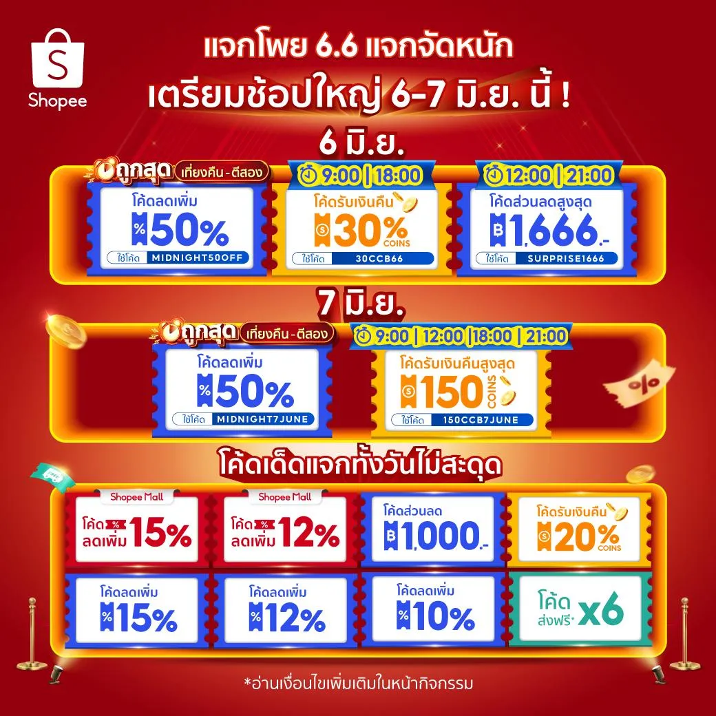 Shopee จัดโปรโมชันลดใหญ่จัดหนักกลางปีกับโปรโมชัน 6.6 Shopee Greatest Brand Celebration ลดใหญ่แบรนด์ดังสูงสุด 80% พร้อมแจกโค้ดส่วนลด Shopee Mall ลดสูงสุด 15% โค้ดรับเงินคืนสูงสุด 30% พร้อมคูปองส่งฟรี มีแจกจัดเต็มตลอดทั้งวัน นักช็อปออนไลน์เตรียมเก็บคูปองส่วนลดกันได้เลย