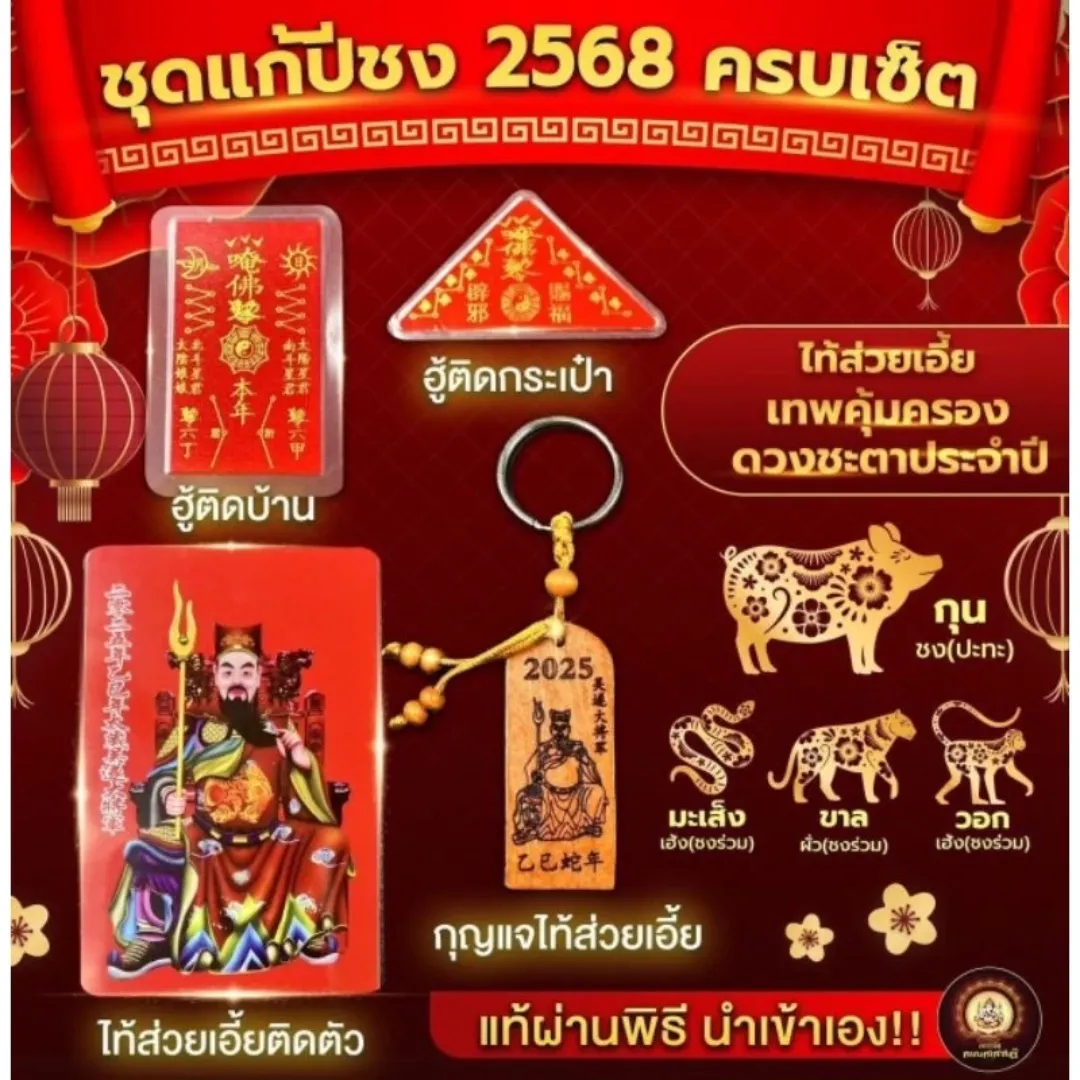 ถัดมากับเครื่องอีกหนึ่งเซ็ตสำหรับเสริมดวงรับปีชง 2568 นี้กับเซ็ตแก้ปีชง 2568 เทพไท่ส่วยเอี๊ยะ เทพที่ช่วยคุ้มครองดูแลดวงชะตาของคนเกิดปีชงในปีนี้ ภายในเซ็ตประกอบไปด้วย ที่ห้อยกุญแจ ฮู้ติดบ้าน ฮู้ติดกระเป๋า และภาพของเทพเจ้าไท่ส่วยเอี๊ยสำหรับพกติดตัว