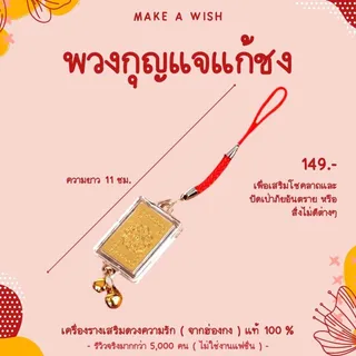 พวงกุญแจแก้ชงจากร้าน Make a Wish พวงกุญแจมงคลที่ผ่านพิธีปลุกเสกโดยซินแส ณ วัดหวังต้าเซียน ช่วยเสริมมงคลในหลายด้าน ไม่ว่าจะเป็นเรื่องของความโชคดี ปัดเป่าภัยอันตรายต่างๆ ที่อาจเข้ามาในชีวิต รวมถึงสิ่งไม่ดีอื่นๆ อีกด้วย พวงกุญแจมาพร้อมกับสายคล้อง ความยาวทั้งหมด 11 ซม. จะนำไปคล้องกับกุญแจ กระเป๋า หรือเคสโทรศัพท์ก็ได้