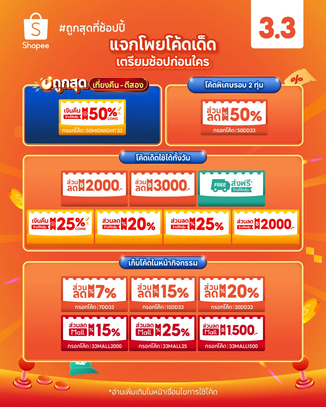 สำหรับในเดือนมีนาคมนี้ Shopee นำเสนอโปรโมชัน 3.3 ที่มาพร้อมส่วนลดต่างๆ มากมาย ภายใต้แคมเปญ “Shopee 3.3 ลดใหญ่ต้นปี” มีสินค้าจากหลากหลายหมวดหมู่ให้เลือกช็อป ไม่ว่าจะเป็นสินค้าบน Shopee Mall หรือร้านค้ายอดนิยมต่างๆ และยังมีโค้ดส่วนลด โค้ดเงินคืน และโค้ดส่งฟรีให้ใช้มากมาย สามารถเก็บโค้ดได้แล้วตั้งแต่วันที่ 28 ก.พ.-3 มี.ค. 2568 นี้ และสามารถเริ่มใช้โค้ดได้ตั้งแต่วันที่ 2 มี.ค. 2568 เวลา 20.00 น. เป็นต้นไป