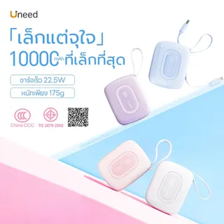 พาวเวอร์แบงก์เป็นอีกหนึ่งของขวัญจับฉลากที่มีประโยชน์ นำไปใช้งานได้จริง สำหรับพาวเวอร์แบงก์ UNEED รุ่นนี้ เป็นรุ่นยอดนิยม มีขนาดเล็ก ดีไซน์น่ารัก สีสันสดใส มาพร้อมความจุ 10000 mAh และยังรองรับการชาร์จไว 22.5 วัตต์ มีสายชาร์จมาให้ในตัวทั้ง USB-C และ Lightning สามารถนำขึ้นเครื่องบินได้ และยังผ่านการรับรองมาตรฐาน CCC สามารถนำเข้าประเทศจีนได้