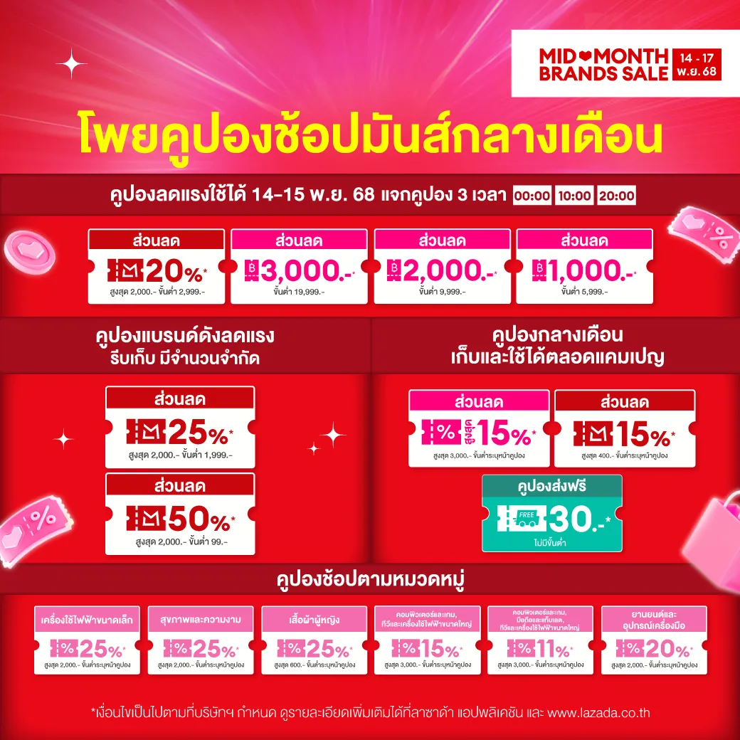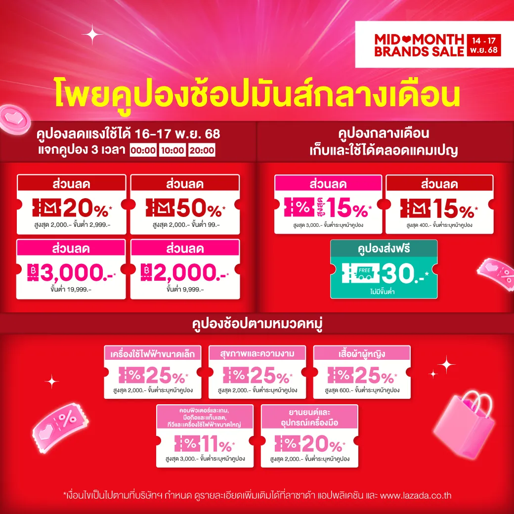 สำหรับโปรโมชันกลางเดือน Lazada กลับมาพร้อมแคมเปญใหญ่ Lazada Mid Month Sale 11.15 ช็อปสุดคุ้มกับดีลเด็ดตลอด 3 วันเต็ม สินค้าลดสูงสุดถึง 90% พร้อมแจกคูปองส่วนลดจากแพลตฟอร์มสูงสุด 3,000 บาท และคูปองจากร้านค้าสูงสุด 20% พร้อม Lazada ช่วยเปย์ สูงสุดถึง 70% และคูปองส่งฟรี เตรียมตัวเก็บโค้ดและช็อปกันให้จุใจระหว่างวันที่ 15 - 17 พฤศจิกายน 2568