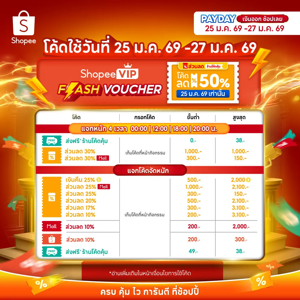 Shopee ต่อเวลาให้ช็อปคุ้มยาวถึงสิ้นเดือน กับโปรโมชัน Shopee Pay Day Sale 1.25 เงินออก ช็อปเลย สินค้าแบรนด์ดังลดราคาสูงสุด 70% พร้อมโค้ดส่วนลดร้าน Shopee Mall 25% และโค้ดส่งฟรีไม่มีขั้นต่ำ รอช็อปส่งท้ายเดือนมกราคมกันได้เลยตั้งแต่วันที่ 25-27 ม.ค. 69
