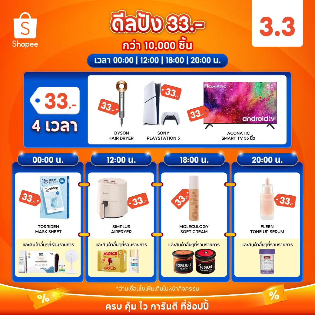 Shopee 3.3 นอกจากจะแจกโค้ดส่วนลดแบบจุใจแล้ว ยังมีดีลปังราคาเพียง 33 บาท ให้เลือกช็อปตลอดวันรวมสินค้ากว่า 10,000 ชิ้น งานนี้มือต้องไว ใจต้องนิ่ง เพราะสินค้ามีจำนวนจำกัดมาก!